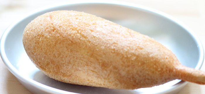 北海道のフレンチドッグ最大の特徴が、グラニュー糖をまぶして食べるスタイル。外はカリッと、中はジューシーなソーセージ・・・ではなく魚肉ソーセージ。一見ミスマッチに思えますが、食べてみると意外なほど相性が良いような気がします。