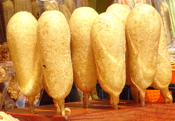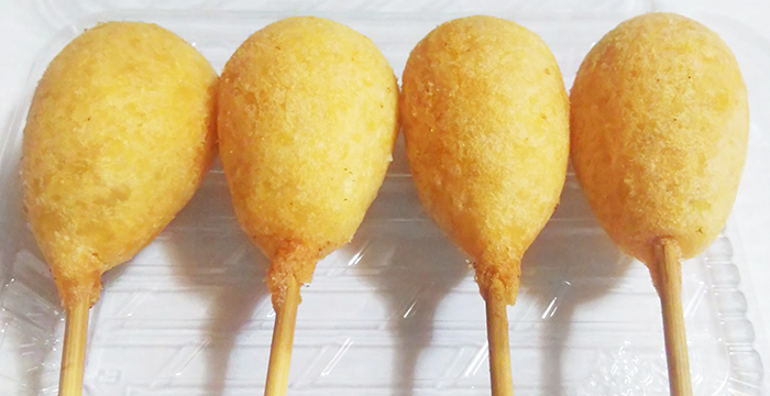 ・コーンドッグ:フランクフルトソーセージにコーンミールの生地をつけて揚げたもの(ケチャップ・マスタード等を付ける)